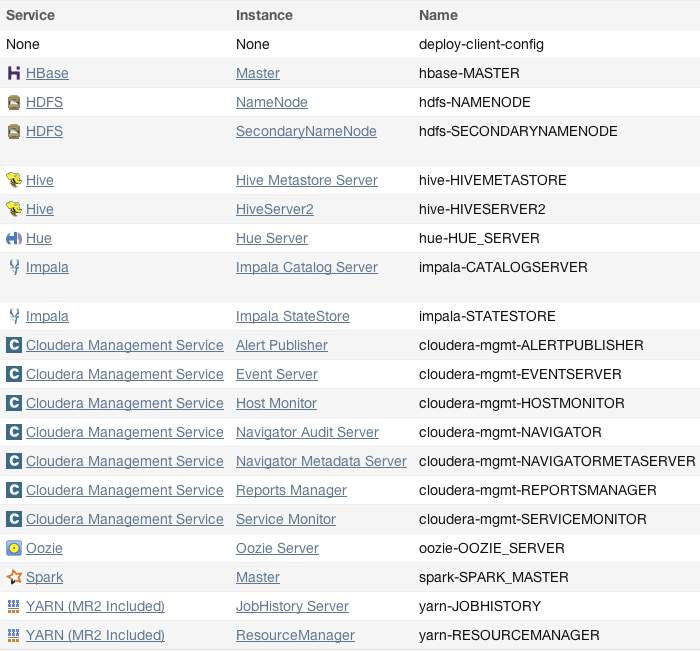 A common point of confusion is the overloading of the terms service and role for both types and instances; Cloudera Manager and this section sometimes uses the same term for type and instance. For example, the Cloudera Manager Admin Console tab and menu lists service instances. This is similar to the practice in programming languages where for example the term "string" may indicate either a type (java.lang.String) or an instance of that type ("hi there"). When it's necessary to distinguish between types and instances, the word "type" is appended to indicate a type and the word "instance" is appended to explicitly indicate an instance.